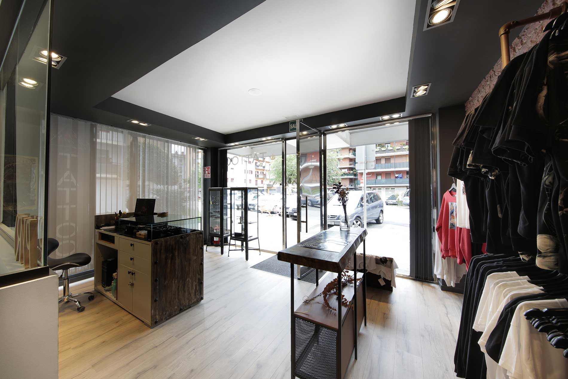 Tatuajeen estudioko barne-diseinuko proiektu osoa: dendako sarrera, bulegoa eta tatuaje-gela.